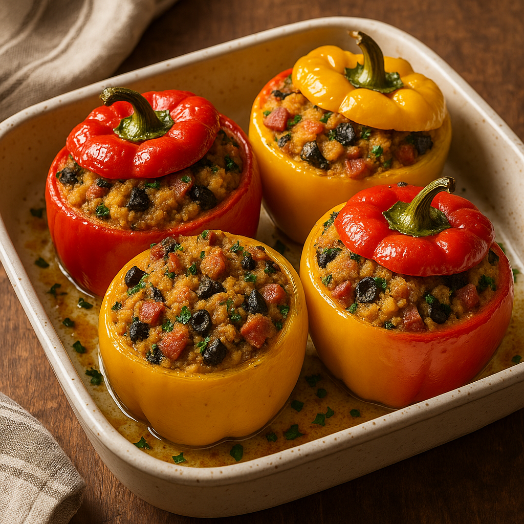 Descrizione della ricetta:I peperoni imbottiti alla napoletana sono un gustoso secondo piatto (o piatto unico) della tradizione partenopea. I peperoni vengono svuotati e farciti con un ripieno ricco di mollica di pane, formaggio, salumi (come salame o prosciutto), olive, capperi, acciughe ed erbe aromatiche. Vengono poi cotti al forno fino a doratura o, in alcune versioni, fritti interi. Il risultato è un piatto sapido, intenso, perfetto anche servito freddo.