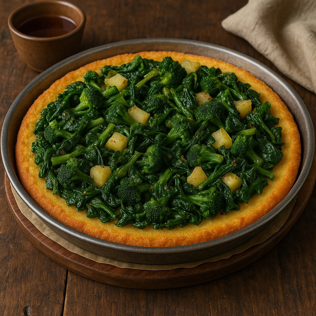 La Pizza di granturco con verdure è una preparazione rustica e genuina: una base di farina di mais (tipo polenta), stesa in teglia e cotta al forno fino a formare una crosta dorata e croccante. Sopra viene distribuito un condimento semplice a base di verdure di stagione saltate in padella: broccoli, cicoria, bietole, patate, o anche zucca e cipolle. Un piatto della tradizione contadina, perfetto come piatto unico, antipasto o per accompagnare salumi e formaggi locali.