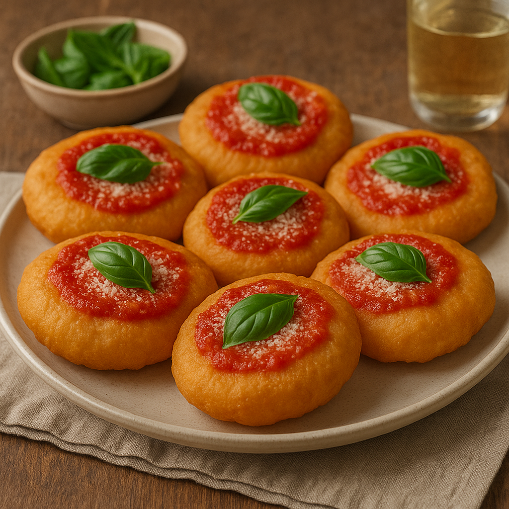 Le montanare nascono nella cucina povera napoletana, quando le donne friggevano piccoli dischi di impasto del pane per sfamare le famiglie numerose dei Quartieri Spagnoli. Il nome deriva da una versione che si preparava nelle zone montane dell’entroterra campano, condita semplicemente con ciò che si aveva: un cucchiaio di salsa e un po’ di formaggio. Oggi sono protagoniste di ogni friggitoria partenopea e tra gli antipasti delle pizzerie tradizionali.