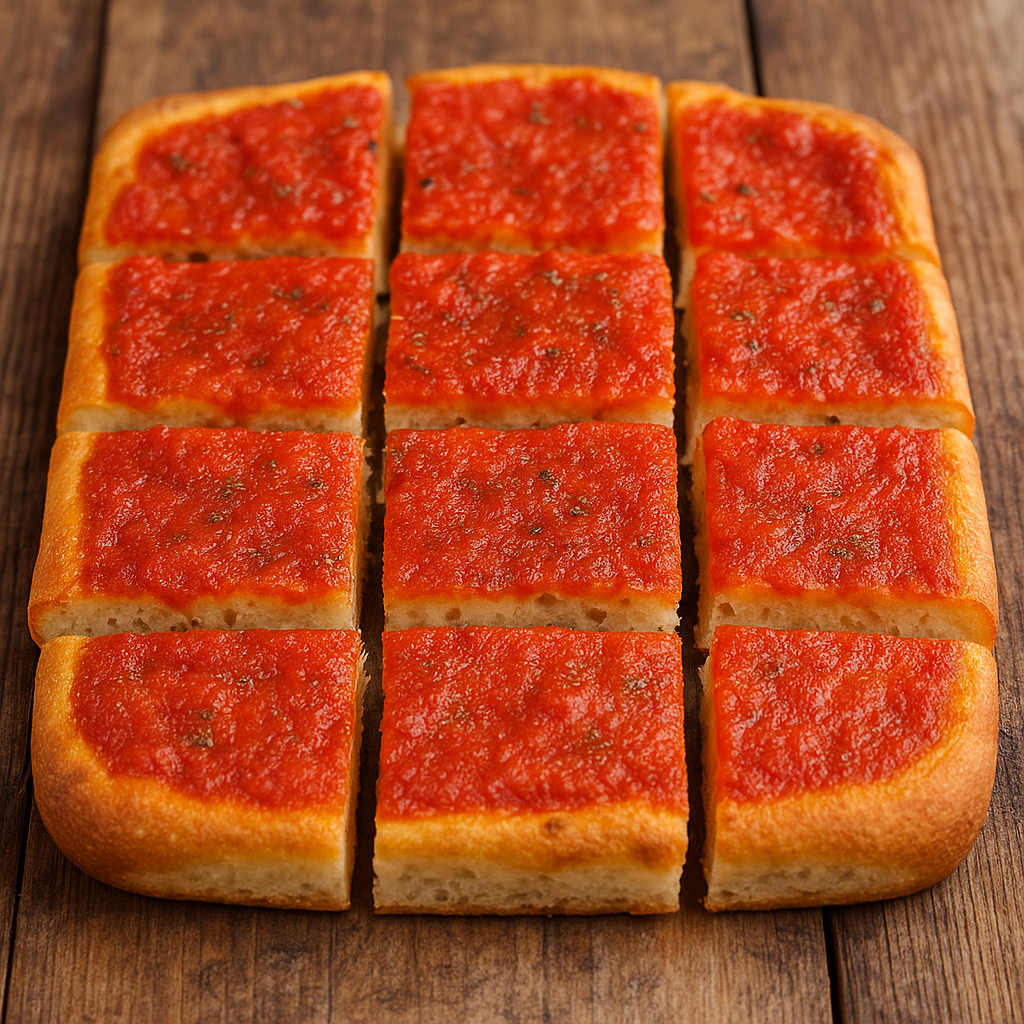 La Focaccia al pomodoro abruzzese è un lievitato alto e soffice, riccamente condito con salsa di pomodoro, olio extravergine d’oliva, sale e origano. Viene cotta in teglia e servita in quadretti o rettangoli, perfetta come merenda, antipasto o street food da gustare in piedi.