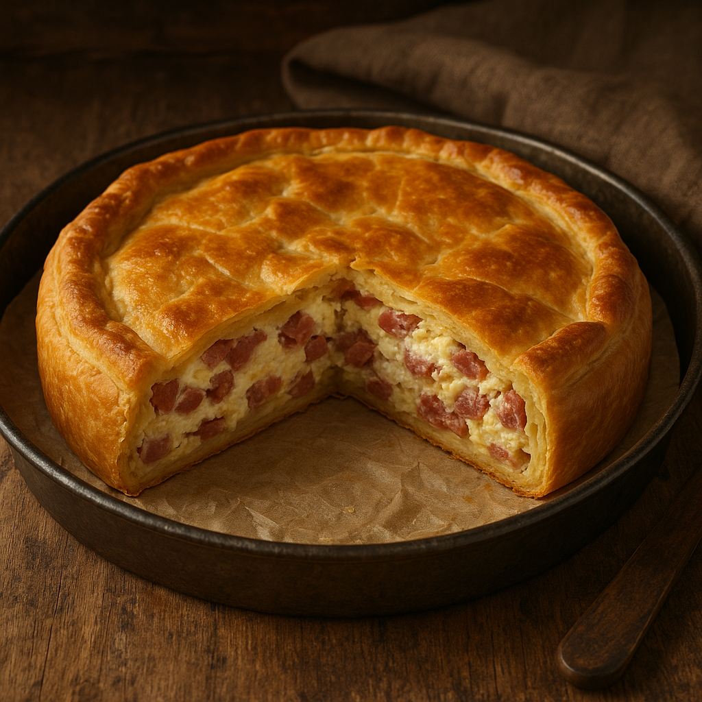 La Pizza rustica abruzzese è un guscio dorato di pasta sfoglia (o pasta brisée in alcune varianti) ripieno di un ricco mix di formaggi e salumi locali. Il ripieno, cremoso e saporito, è solitamente a base di ricotta, pecorino, scamorza, uova e prosciutto crudo o cotto, ma può includere anche salame, ventricina e altri prodotti tipici.