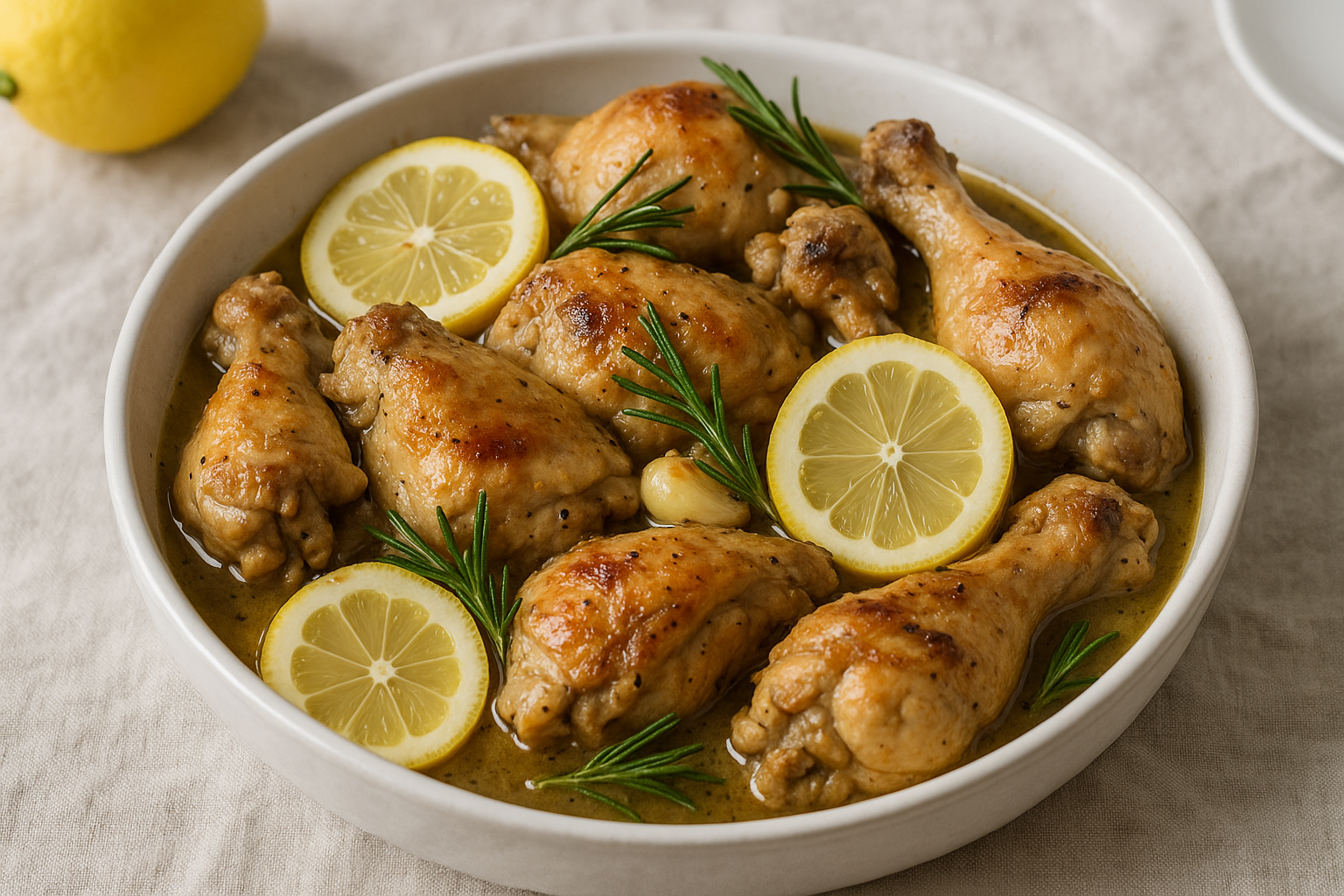 📖 DescrizioneIl Pollo con Limone e Rosmarino alla Messinese è una ricetta semplice, aromatica e profondamente legata alla tradizione casalinga della provincia di Messina. La carne di pollo viene marinata e poi cotta lentamente con succo di limone fresco, aglio e rametti di rosmarino, sprigionando profumi mediterranei intensi e irresistibili. È un secondo piatto leggero ma gustoso, perfetto per accompagnare contorni di stagione.
