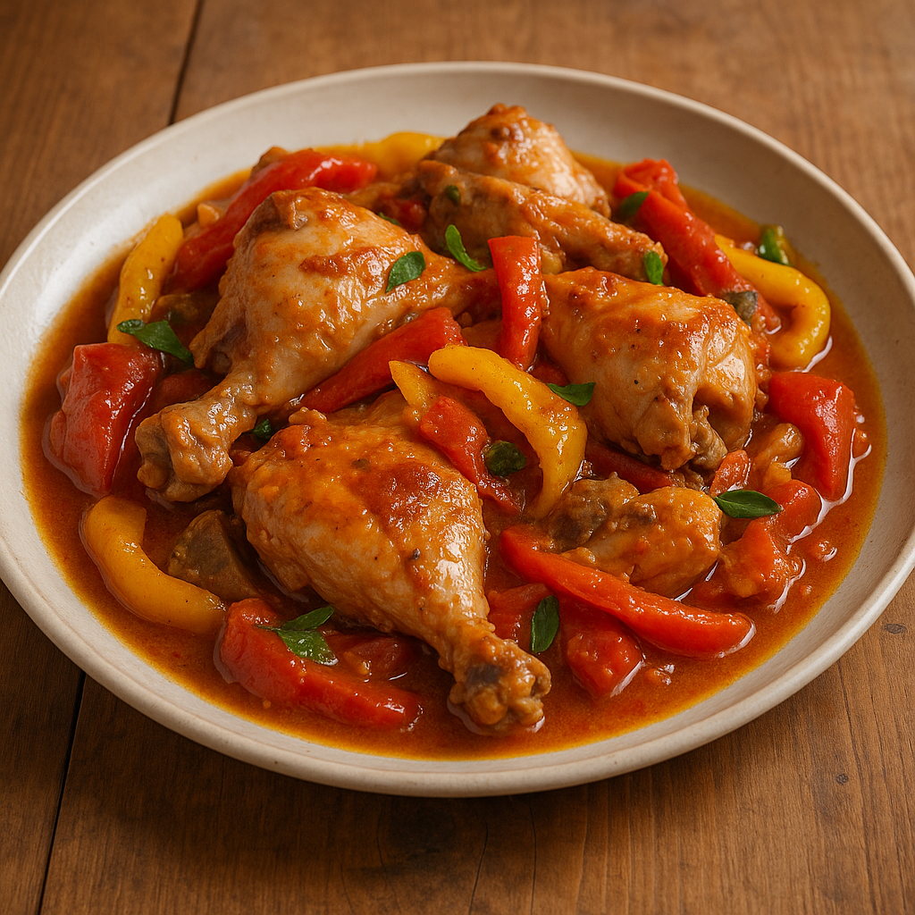 Il piatto è saporito, colorato e ricco di profumi: la carne si insaporisce lentamente nel sugo, mentre i peperoni diventano morbidi e dolci, creando un condimento perfetto anche per il pane.
