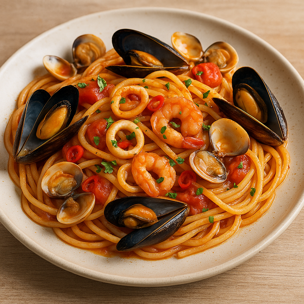 Gli Spaghetti alla Pescatora sono un primo piatto di mare ricco, saporito e profumato, a base di frutti di mare freschi (come cozze, vongole, calamari, gamberi), pomodorini o passata di pomodoro, aglio, prezzemolo e peperoncino. Il tutto è insaporito con vino bianco secco per esaltare il sapore del pescato. A seconda delle zone, la ricetta può essere in bianco (senza pomodoro) oppure in rosso (con sugo). È un piatto che racconta tutto il fascino delle coste italiane, semplice ma raffinato.
