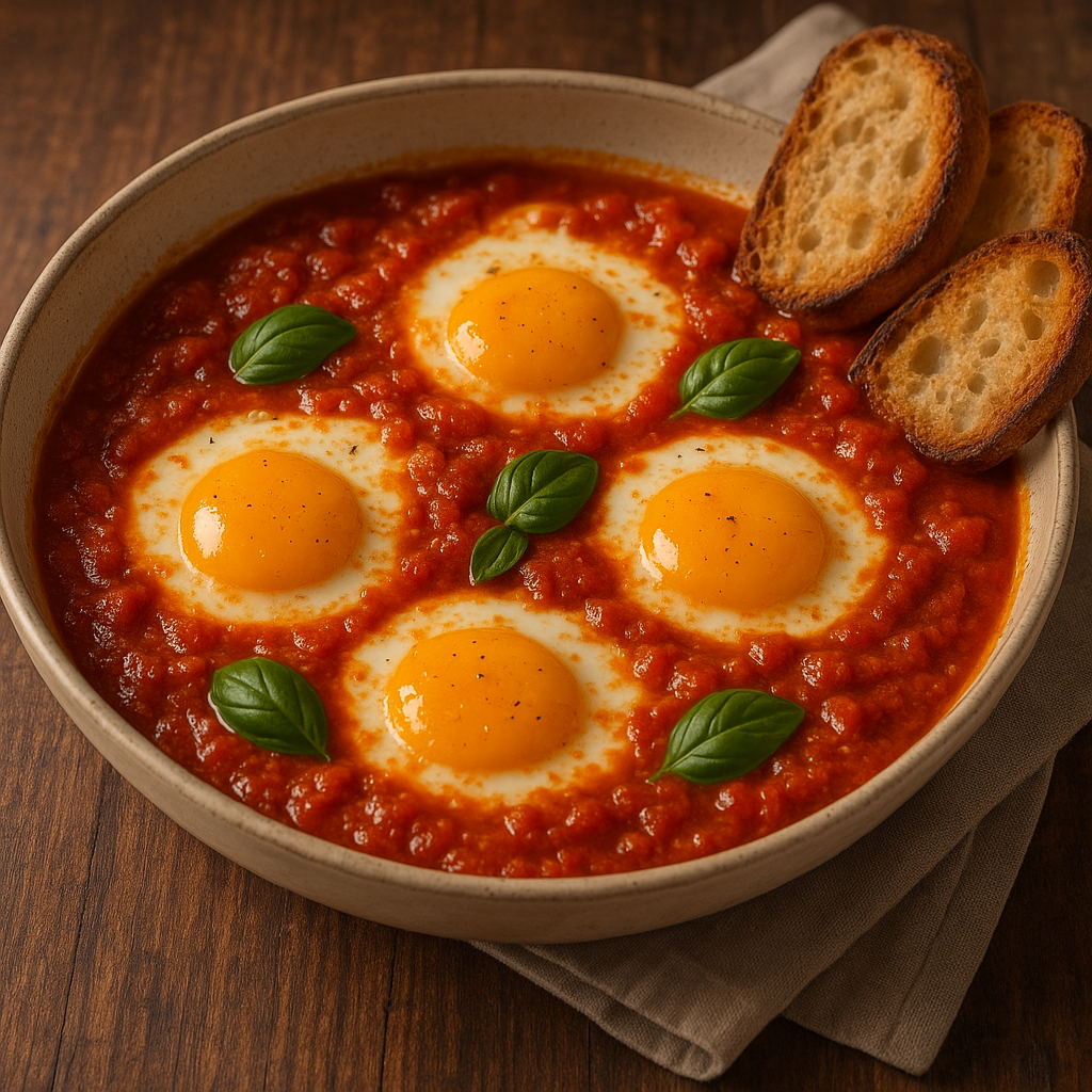 - Uova: Rompere delicatamente le uova nel sugo, facendo attenzione a non rompere i tuorli. Coprire con coperchio e lasciar cuocere per 4–5 minuti, finché l’albume si rapprende ma il tuorlo resta morbido.