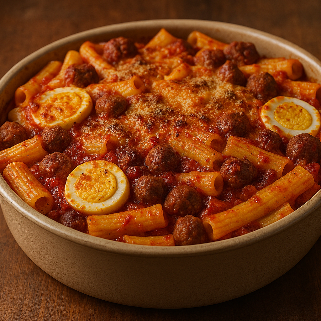 - Assembla il timballo: in una teglia imburrata e cosparsa di pangrattato, versa uno strato di pasta, poi le uova sode a fette, le polpettine, i cubetti di caciocavallo, un po’ di salame e altro ragù. Ripeti fino a esaurimento degli ingredienti, terminando con sugo e formaggio.