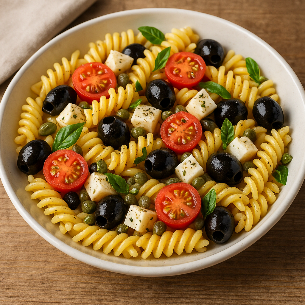📌 DescrizioneL’insalata di pasta alla Mediterranea è un primo piatto freddo, colorato e gustoso, ideale per l’estate. Preparata con pomodorini, olive, capperi, mozzarella e basilico fresco, rappresenta la sintesi perfetta della cucina del Sud Italia. Leggera, nutriente e semplice da realizzare, è ottima da preparare in anticipo e portare al mare, in ufficio o a un picnic.