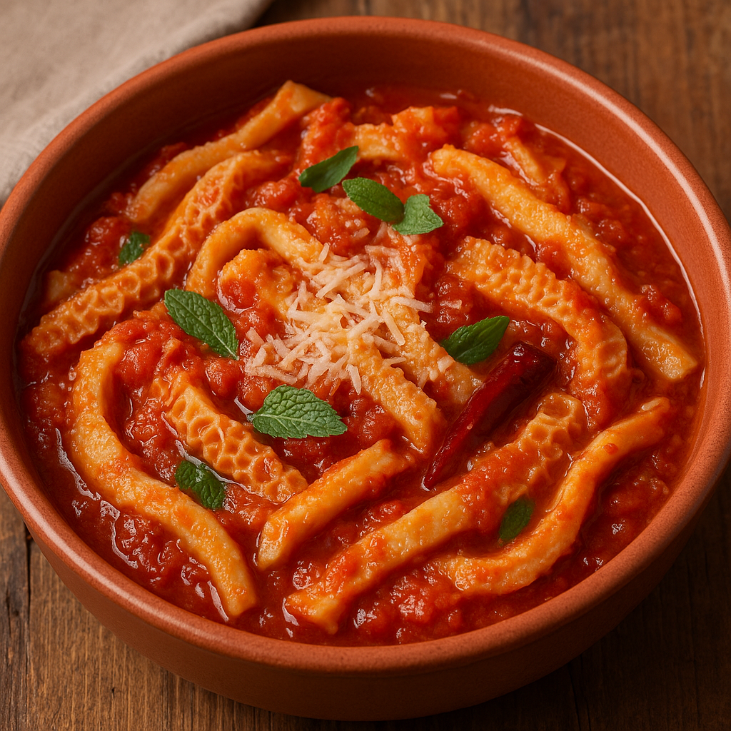 La Trippa alla lucana è un piatto povero ma ricco di sapore, preparato con trippa di vitello o agnello cotta lentamente in un sugo profumato a base di pomodoro, aglio, peperoncino e mentuccia selvatica. La cottura lenta ammorbidisce le carni e permette agli aromi di amalgamarsi. In molte versioni locali, la ricetta viene completata con pecorino grattugiato, che aggiunge sapidità e rotondità al piatto.