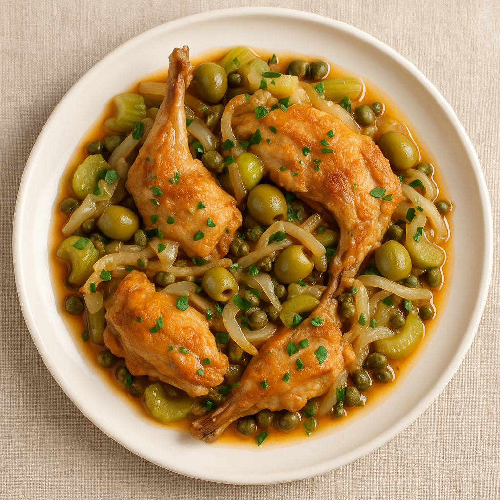 📌 DescrizioneIl Coniglio alla Stimpirata è un piatto siciliano ricco di profumi e contrasti, preparato con il coniglio fritto o rosolato e poi insaporito con una salsa agrodolce a base di aceto, zucchero, sedano, cipolla, olive verdi e capperi. Il piatto ha antiche origini contadine ed è perfetto anche servito freddo, il giorno dopo, quando i sapori risultano ancora più amalgamati.