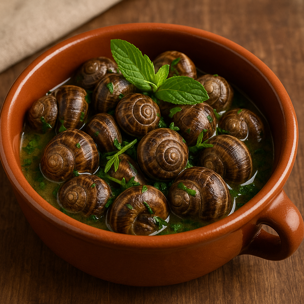 Le lumache alla menta sono un piatto tradizionale rustico che prevede la lenta cottura delle lumache con erbe aromatiche, in particolare menta fresca, aglio e spesso anche finocchietto selvatico. Il piatto esalta il sapore delicato ma terroso delle lumache, arricchendole con note fresche e balsamiche. Le lumache vengono solitamente spurgate e sbollentate prima della cottura vera e propria.
