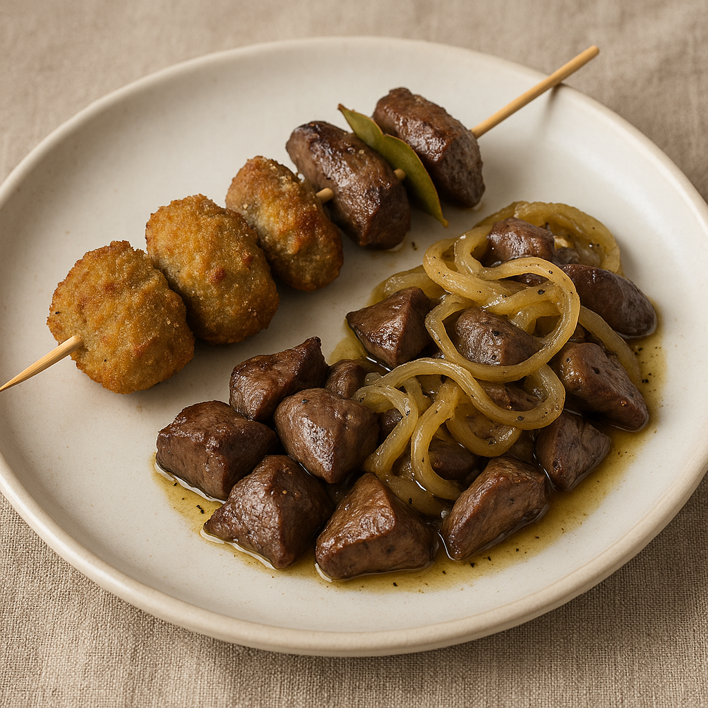 I fegatini di agnello alla napoletana sono un piatto rustico e saporito, preparato in due varianti tradizionali: impanati e fritti oppure saltati in padella con cipolla e vino bianco. In entrambi i casi, il risultato è gustoso e aromatico. Spesso serviti come spiedini o accompagnamento nei pranzi pasquali, sono un esempio della cucina di recupero che valorizza tutte le parti dell’animale.