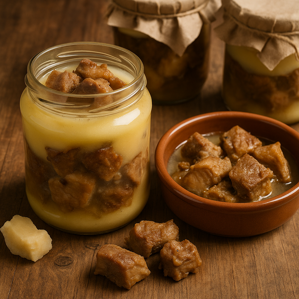 Nel Molise rurale, la macellazione del maiale era un rito collettivo e festoso, detto “lu puorc”. Ogni parte del suino veniva valorizzata: prosciutti, salsicce, ciccioli, pancetta… ma anche tagli “meno nobili” venivano conservati sotto strutto fuso, in recipienti di terracotta o vetro. Questi vasetti venivano tenuti in cantina e utilizzati durante l’anno. La sugna proteggeva la carne dall’aria, evitando il deterioramento. Bastava scaldarla leggermente per gustarla, spesso insieme a verdure di stagione o pane abbrustolito.