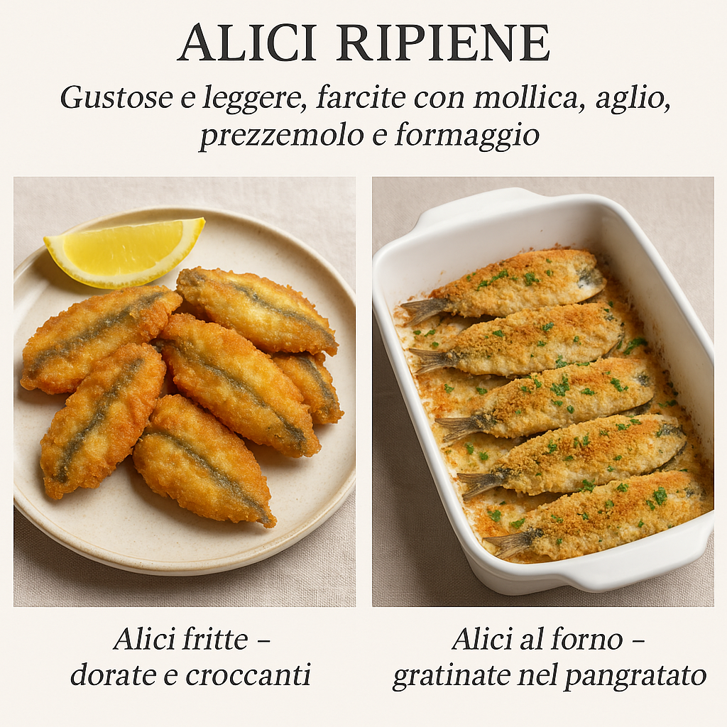 - Frittura: passare le alici farcite nella farina o pangrattato e friggere in olio caldo finché dorate.