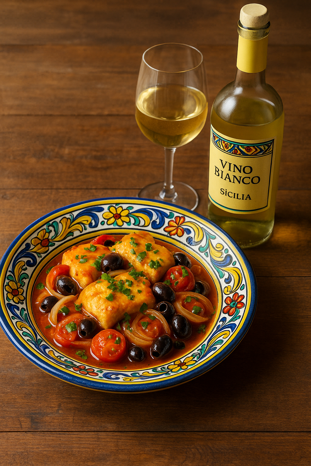 - Vino: bianco strutturato come un Verdeca del Salento o un Fiano pugliese.