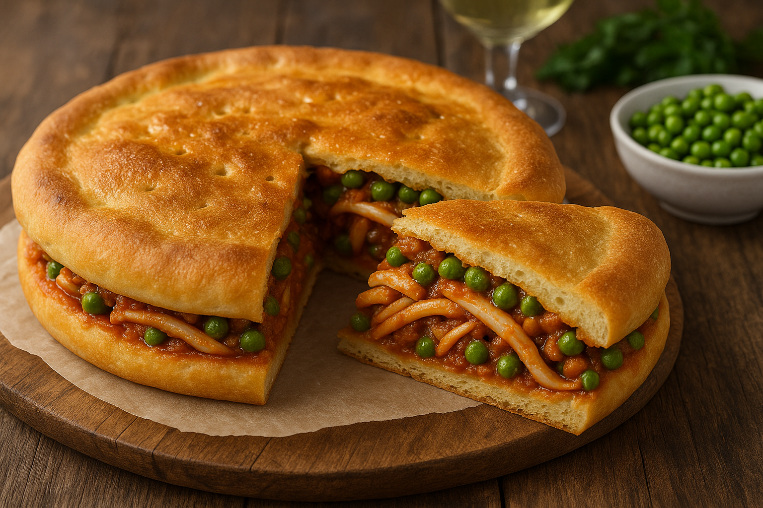 📖 DescrizioneUna focaccia rustica e morbida, farcita con un sugo ricco a base di seppie tenere e piselli dolci, insaporita da cipolla, pomodoro e vino bianco. Un piatto che unisce il profumo del mare con la semplicità della tradizione contadina siciliana.