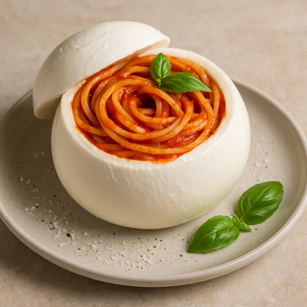 Questa ricetta è una creazione moderna che nasce tra Campania e Puglia, terre in cui mozzarella e pasta sono regine della tavola. Le prime tracce della mozzarella farcita risalgono agli anni ‘80, ma è soprattutto negli ultimi decenni che è diventata un classico delle trattorie del Sud e degli show cooking estivi. La versione con spaghetti al pomodoro all’interno esalta il connubio tra sapori familiari e presentazione innovativa. È anche un piatto antispreco: si presta a essere preparato con pasta avanzata.