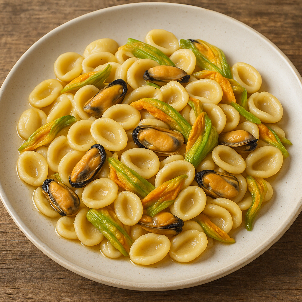 Le orecchiette e i cavatelli sono simboli della pasta fatta in casa nel Mezzogiorno d’Italia, in particolare in Puglia e Basilicata. Le cozze, pescate lungo le coste adriatiche e ioniche, sono state parte integrante della cucina povera di mare. I fiori di zucca, coltivati negli orti familiari, venivano usati freschi in frittate o primi piatti. L’unione di questi ingredienti nasce nelle cucine domestiche del Sud negli ultimi decenni, come reinterpretazione leggera e profumata dei classici piatti di mare.