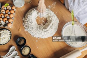 - Sciogli il lievito in acqua tiepida con lo zucchero. Aggiungi la farina poco per volta, la scorza d’arancia e il sale. Mescola con un cucchiaio di legno fino a ottenere un impasto morbido e appiccicoso.