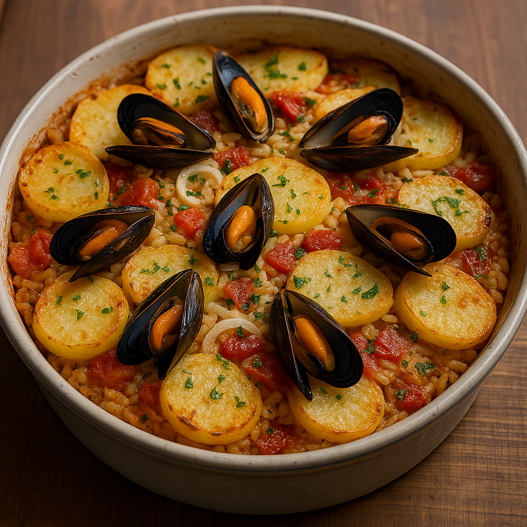 La Tiella barese è un piatto unico e completo, preparato con riso, patate e cozze, disposti a strati in una teglia (in dialetto “tièdde”) e cotti lentamente al forno con pomodori, cipolla, aglio e prezzemolo. La cottura avviene con acqua e liquido delle cozze, che permette al riso di assorbire tutti i sapori. Simile nella costruzione alla paella spagnola, la tiella si distingue per la sua intensità marina, il contrasto tra morbido e croccante, e l’uso sapiente di pochi ingredienti semplici.