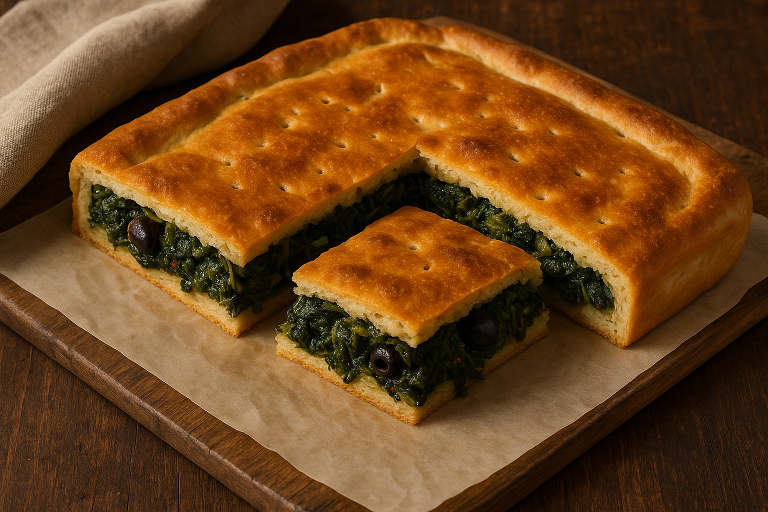 📝 Descrizione:La Scacciata Catanese con Spinaci e Olive è una variante vegetariana e saporita della tradizionale focaccia siciliana, tipica del periodo natalizio ma ormai gustata tutto l’anno. Ispirata ai sapori del territorio, combina la morbidezza dell’impasto con il gusto terroso degli spinaci saltati e la nota sapida delle olive nere, creando un perfetto equilibrio tra genuinità e golosità.