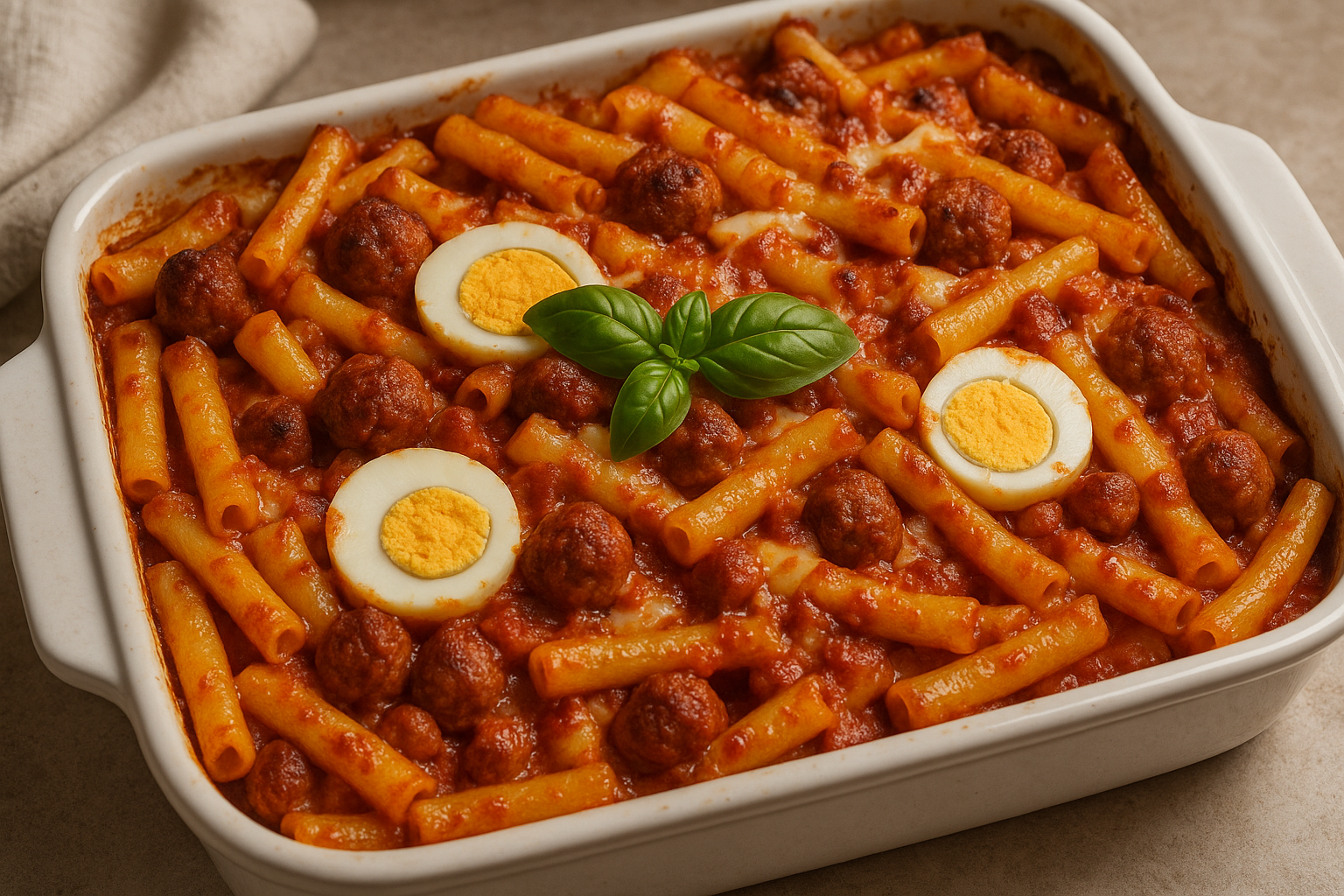 Gli Ziti al forno alla calabrese rappresentano uno dei piatti più ricchi e celebrativi della cucina casalinga calabrese. Tipici delle domeniche in famiglia e delle feste, si distinguono per l’abbondanza di ingredienti: ziti spezzati conditi con ragù di carne, piccole polpettine fritte, uova sode, formaggi e a volte salumi. Il tutto viene cotto al forno fino a formare una crosticina dorata e saporita.