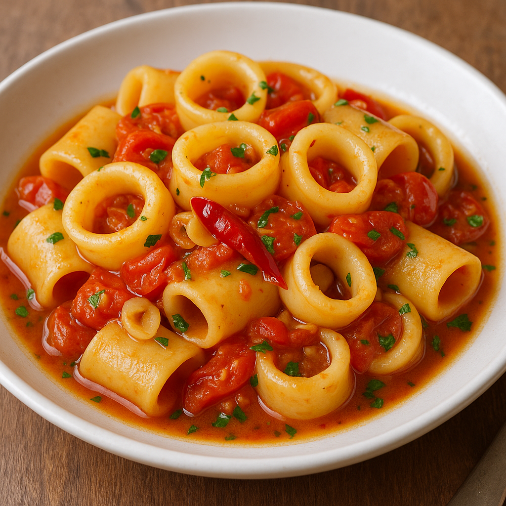 La Calamarata ha origini napoletane e si è diffusa lungo tutta la Costiera Amalfitana e la zona del Vesuvio. La particolarità della ricetta è l’uso della pasta omonima, ideata per evocare la forma dei calamari tagliati ad anello. In passato, i pescatori cucinavano questo piatto direttamente a bordo delle barche, con pochi ingredienti raccolti al momento: calamari appena pescati, pomodorini locali e qualche erba aromatica. Da ricetta povera, è diventata un’eccellenza della cucina di mare mediterranea.