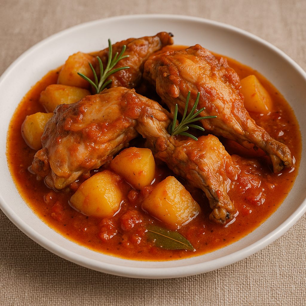 Il coniglio al sugo con patate è un secondo piatto ricco e saporito, tipico della cucina contadina. Il coniglio viene rosolato lentamente e cotto in un sugo di pomodoro aromatizzato con vino, aglio, rosmarino e alloro. Le patate, tagliate a tocchetti, cuociono insieme alla carne, assorbendone i profumi e arricchendo il piatto con gusto e consistenza.