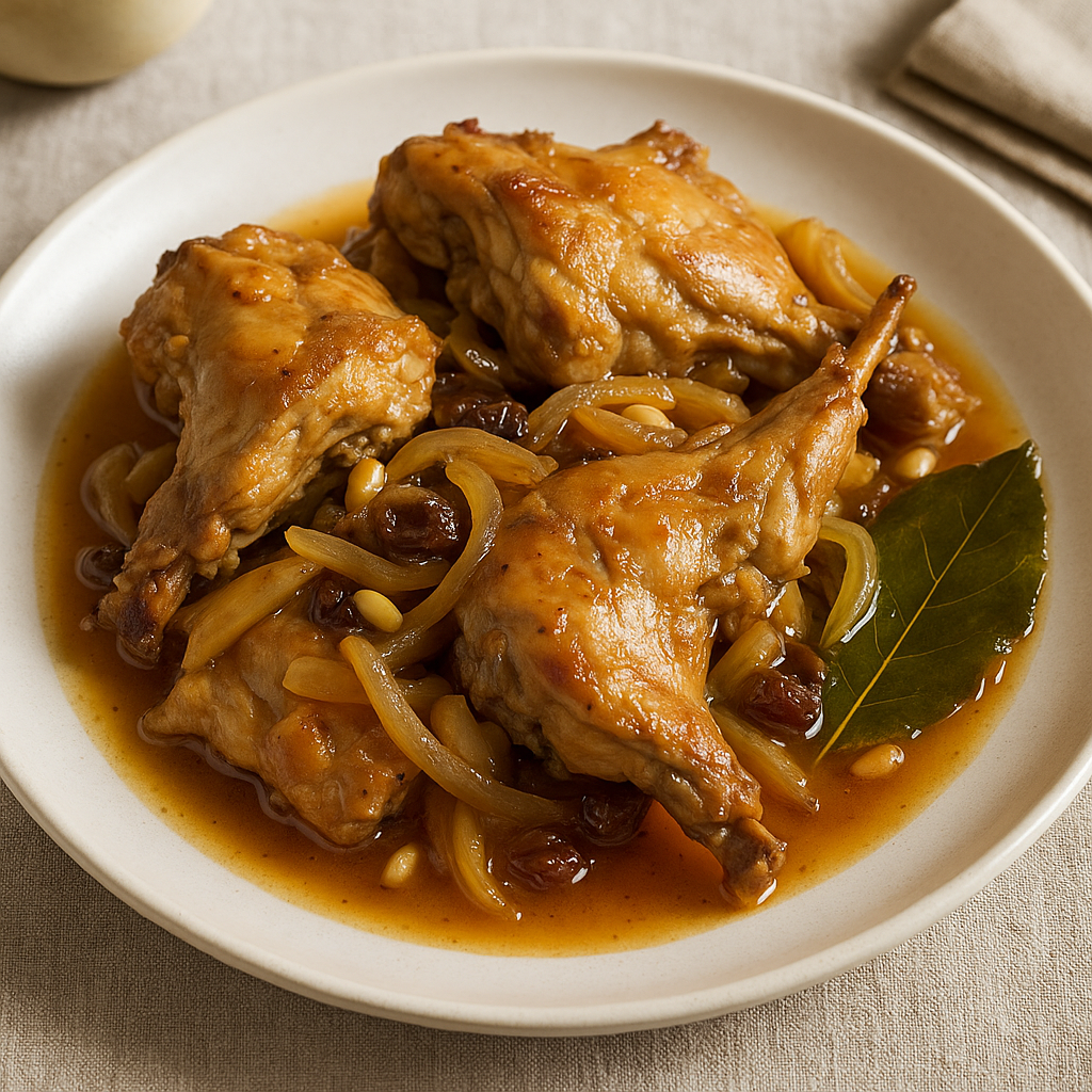 📌 DescrizioneIl coniglio in agrodolce è un secondo piatto tradizionale della cucina siciliana, dal gusto deciso e aromatico. La carne viene rosolata e poi insaporita con un condimento a base di cipolla, aceto, zucchero e uvetta (facoltativa), che crea il classico equilibrio dolce-acido. È una pietanza rustica, perfetta da servire sia calda che a temperatura ambiente, spesso preparata in anticipo per permettere ai sapori di amalgamarsi meglio.