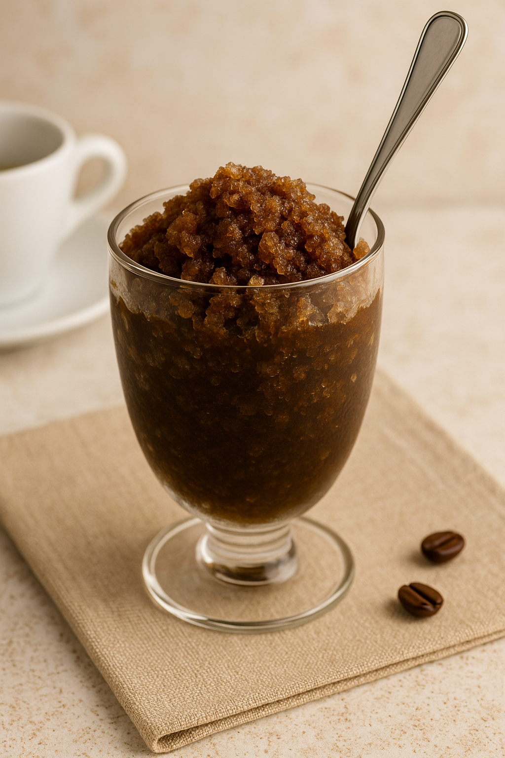 La granita al caffè è una specialità siciliana fresca e aromatica, amata soprattutto a colazione o merenda, spesso accompagnata da panna montata o una soffice brioche col tuppo. Il suo gusto deciso di caffè la rende perfetta per chi ama i sapori intensi, ma è anche rinfrescante e dissetante.