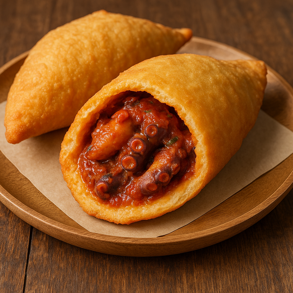 Il polpo alla pignata è un’antica ricetta salentina, risalente a tempi in cui si cuocevano i molluschi nelle “pignate” di terracotta, spesso con pomodoro, cipolla, sedano e prezzemolo. I panzerotti, invece, sono una delle espressioni più note del cibo da strada pugliese. L’idea di unire le due tradizioni nasce nei forni e rosticcerie più innovative, per offrire un’alternativa gourmet alla farcitura classica con mozzarella e pomodoro.