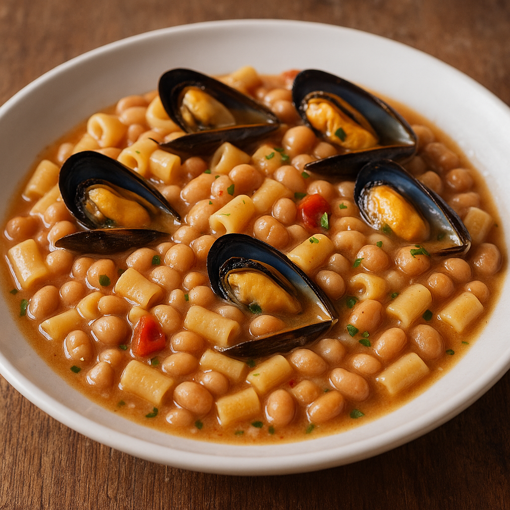 La fusione tra legumi e frutti di mare è tipica della cucina del popolo napoletano, che ha sempre saputo combinare ingredienti umili con ciò che il Golfo offriva. Questa ricetta nasce nei quartieri popolari di Napoli, in particolare nei pressi del porto, dove le cozze erano facilmente reperibili. I fagioli, già protagonisti della versione classica, venivano valorizzati dall’aggiunta del liquido saporito rilasciato dalle cozze durante la cottura. Un piatto che conserva ancora oggi il gusto delle osterie e dei pranzi della domenica.