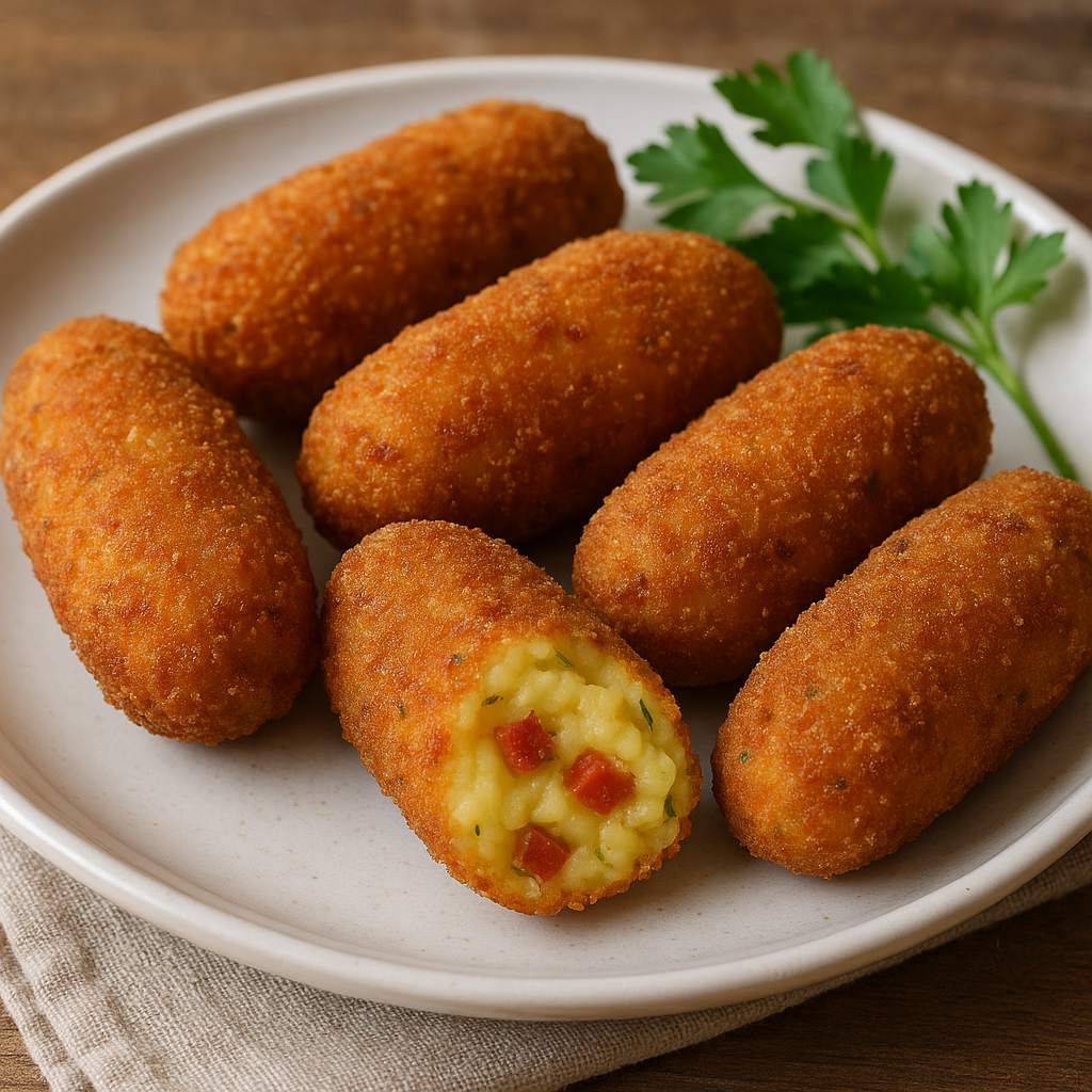 Variante calabrese delle classiche crocchette di patate, arricchita con soppressata calabrese, un salume saporito e leggermente piccante. Perfette per l’aperitivo o come antipasto rustico.