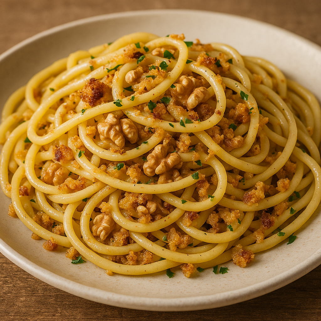 La pasta con mollica è un piatto tipico delle tradizioni contadine, nato come piatto povero e rustico. In molte zone dell’Italia meridionale, in particolare in Molise, il pane raffermo veniva utilizzato per arricchire i piatti di pasta, evitando sprechi e aggiungendo un tocco di sapore. Le noci, che abbondano nelle campagne, sono un’aggiunta che arricchisce ulteriormente il piatto.
