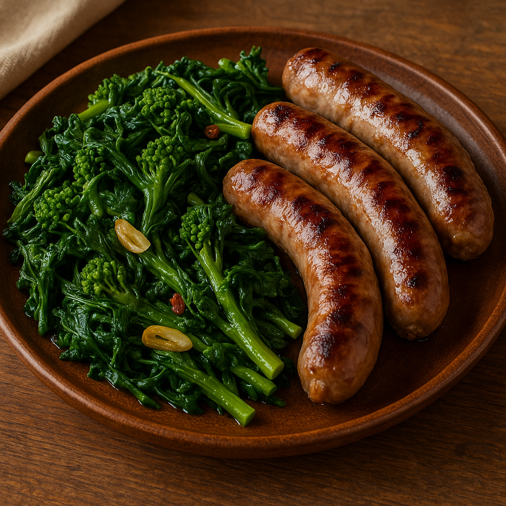 Anche se la versione più celebre di questo piatto è campana (con i friarielli napoletani), in Puglia esiste una variante altrettanto antica, realizzata con le cime di rapa, ortaggio tipico dell’agricoltura locale, soprattutto nel barese e nella Valle d’Itria. La salsiccia, spesso insaporita con finocchietto, si abbina perfettamente al gusto amarognolo delle rape stufate, in un piatto che unisce sapidità, amarezza e dolcezza naturale della carne.