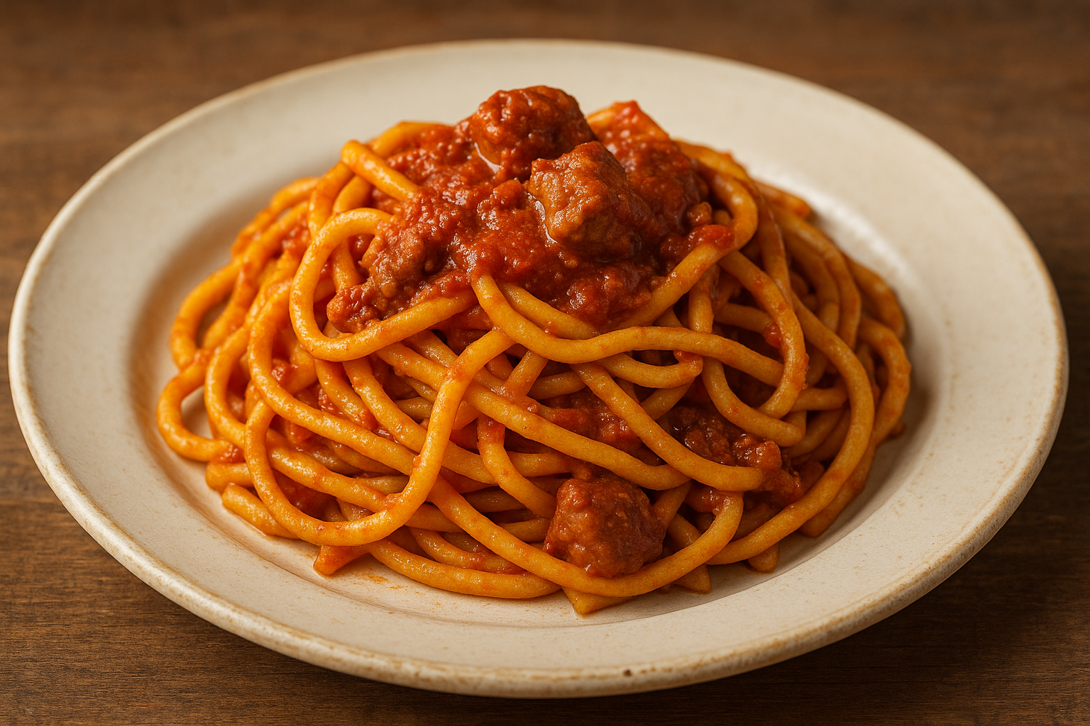 I Maccheroni alla chitarra sono un formato di pasta fresca tipico dell’Abruzzo, ottenuto stendendo la sfoglia e tagliandola con l’“apposito telaio di legno” teso con fili d’acciaio, chiamato appunto chitarra. Il risultato è una pasta a sezione quadrata, ruvida e porosa, ideale per trattenere sughi ricchi. Tradizionalmente, nell’entroterra si condiscono con ragù di carne mista (agnello, maiale e manzo), mentre lungo la costa abruzzese si prediligono sughi di pesce e crostacei.