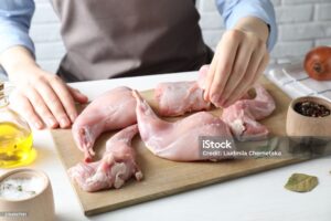 6. Pulizia – Sciacquare i pezzi di coniglio e, se si vuole un gusto più delicato, lasciarli a bagno in acqua e aceto per 30 minuti. Asciugare bene.