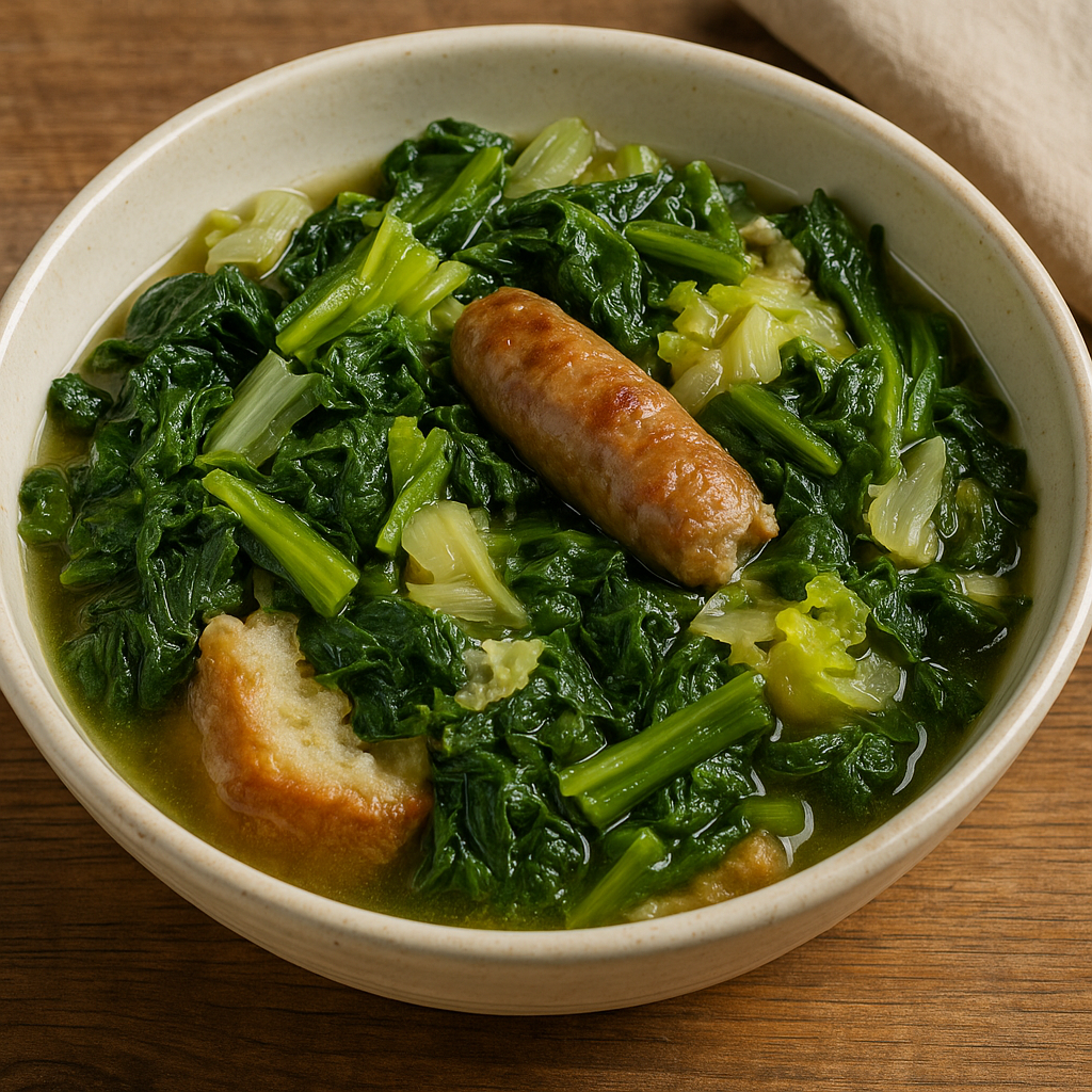 La minestra maritata è una zuppa rustica a base di verdure a foglia (come cicoria, scarola e bietole) unite – cioè “maritate” – a carne di maiale (costine, guanciale, cotiche o salsiccia) e pane raffermo. Si tratta di un piatto unico, ricco e saporito, che rappresenta la cucina del recupero e dell’ingegno contadino.