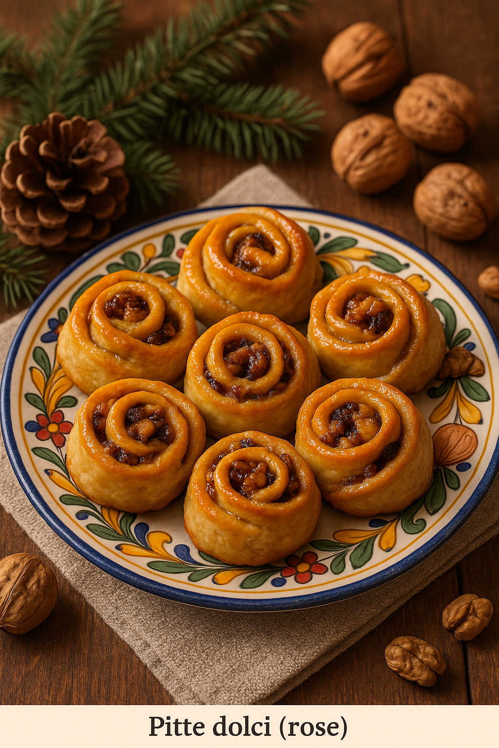 Le pitte dolci, anche chiamate rose calabresi, sono dolcetti natalizi fatti con una pasta simile alla frolla, arrotolata su sé stessa a forma di rosa e farcita con un ripieno profumato di noci, uvetta, cannella e chiodi di garofano. Dopo la cottura, vengono spennellate con miele caldo, che dona loro lucentezza e un gusto avvolgente. Ogni morso racchiude la semplicità e la ricchezza dei sapori antichi della Calabria.