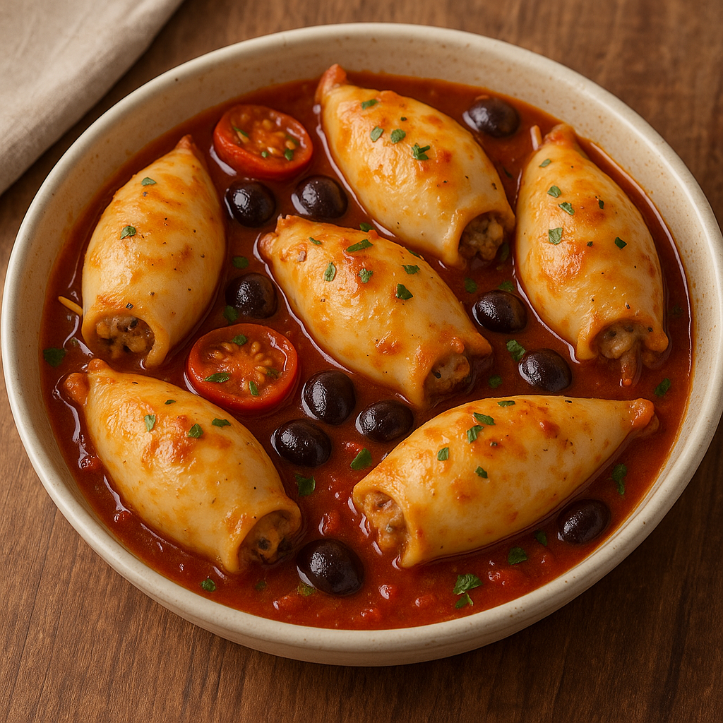 I calamari ripieni all’amalfitana sono un secondo piatto ricco e profumato, tipico della Costiera Amalfitana. I calamari vengono farciti con un composto semplice e mediterraneo a base di mollica di pane, pomodoro, erbe aromatiche, aglio e talvolta formaggio. Si cuociono lentamente in padella o al forno, immersi in un sughetto saporito che ne esalta gusto e morbidezza.