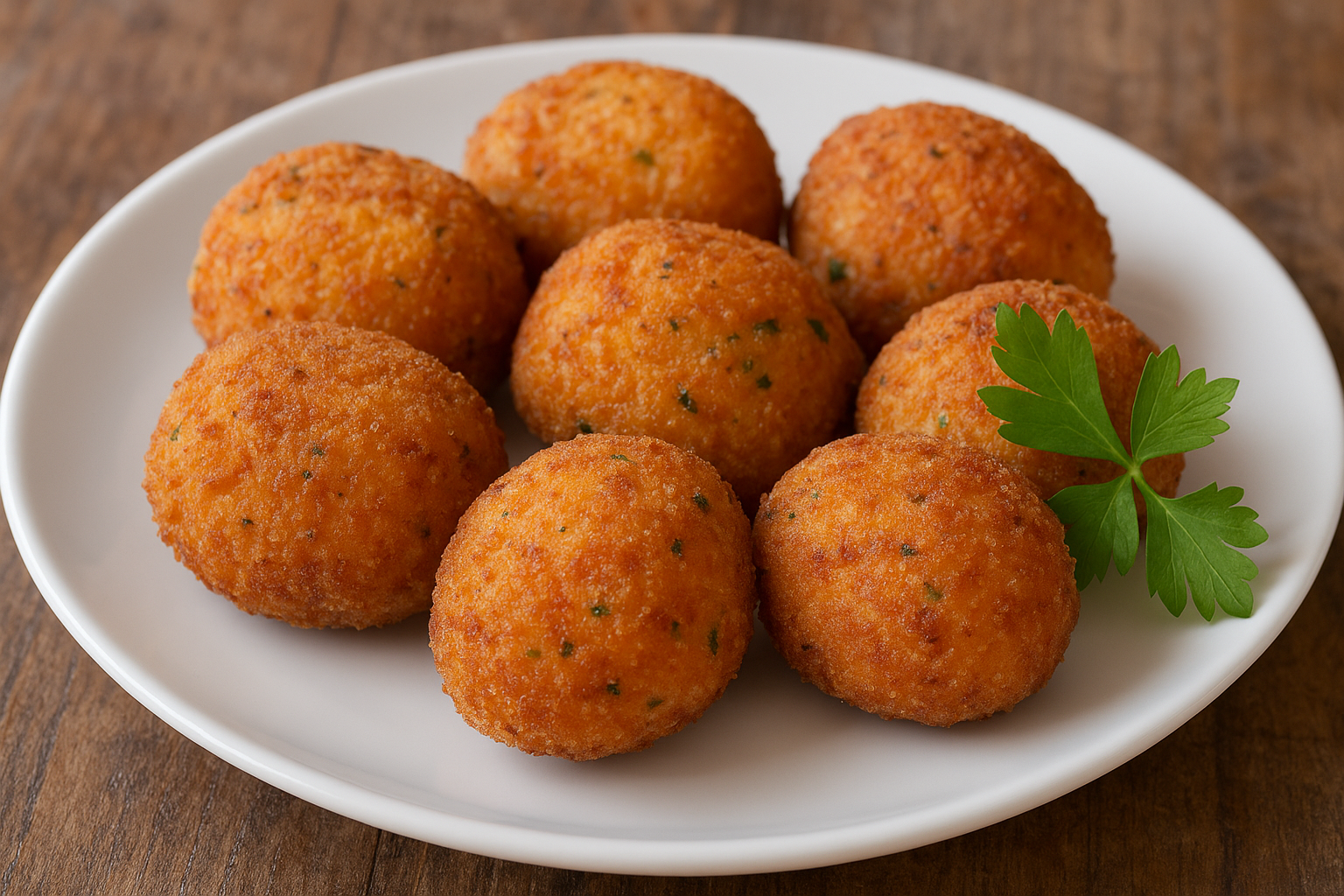 Crocchette fritte a base di ricotta stagionata, pane raffermo e aromi, dorate all’esterno e morbide dentro.