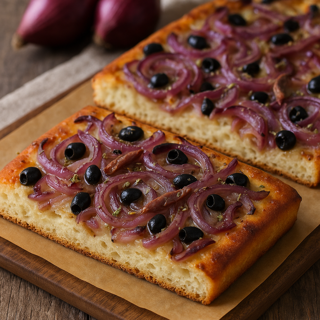 Focaccia rustica della tradizione calabrese, preparata con un impasto semplice e soffice, farcita con cipolle rosse di Tropea affettate finemente. Spesso arricchita con olive nere, acciughe o origano, è un classico da forno gustoso e profumato, perfetto come antipasto, merenda o piatto unico.