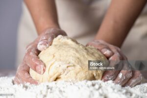 8. In una ciotola capiente, sciogli il lievito e lo zucchero in parte dell’acqua tiepida. Aggiungi la farina gradualmente, poi il sale e infine l’olio. Impasta versando l’acqua poco alla volta fino a ottenere un composto morbido ed elastico. Copri e lascia lievitare per circa 2 ore.
