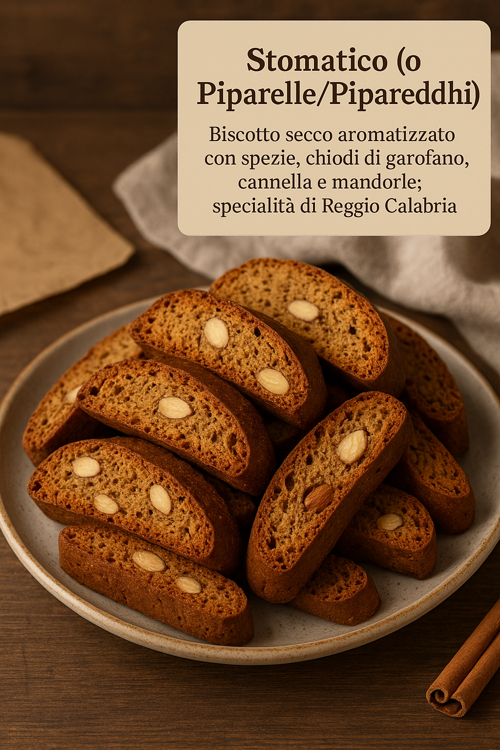 📜 Descrizione storica e culturaleLo Stomatico è un biscotto secco originario della zona di Reggio Calabria, consumato da secoli durante le festività e le occasioni importanti. Il nome "stomatico" deriva probabilmente da "stomachico", termine che indicava un alimento “buono per lo stomaco”, data la presenza di spezie digestive come cannella e chiodi di garofano.Conosciuto anche come Piparelle o Pipareddhi, si lega alla tradizione monastica e casalinga calabrese. La sua consistenza croccante e il sapore deciso lo rendono perfetto da inzuppare nel vino dolce o da gustare come fine pasto.