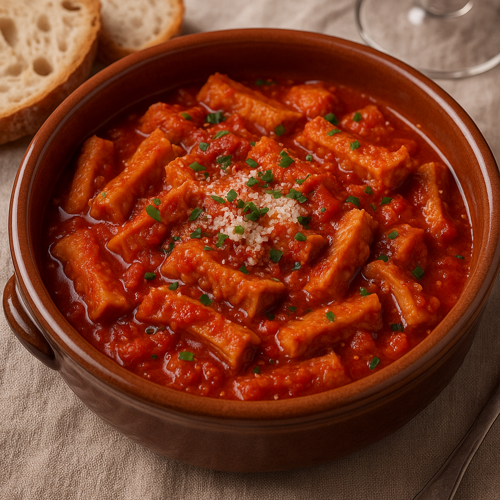 La trippa alla napoletana è un piatto ricco e saporito preparato con trippa di vitello cotta lentamente in umido con passata di pomodoro, aromi, formaggi grattugiati (come pecorino e Parmigiano) e spezie. Il risultato è una pietanza corposa, profumata e appagante, spesso servita con pane casereccio per raccogliere il gustoso sugo.