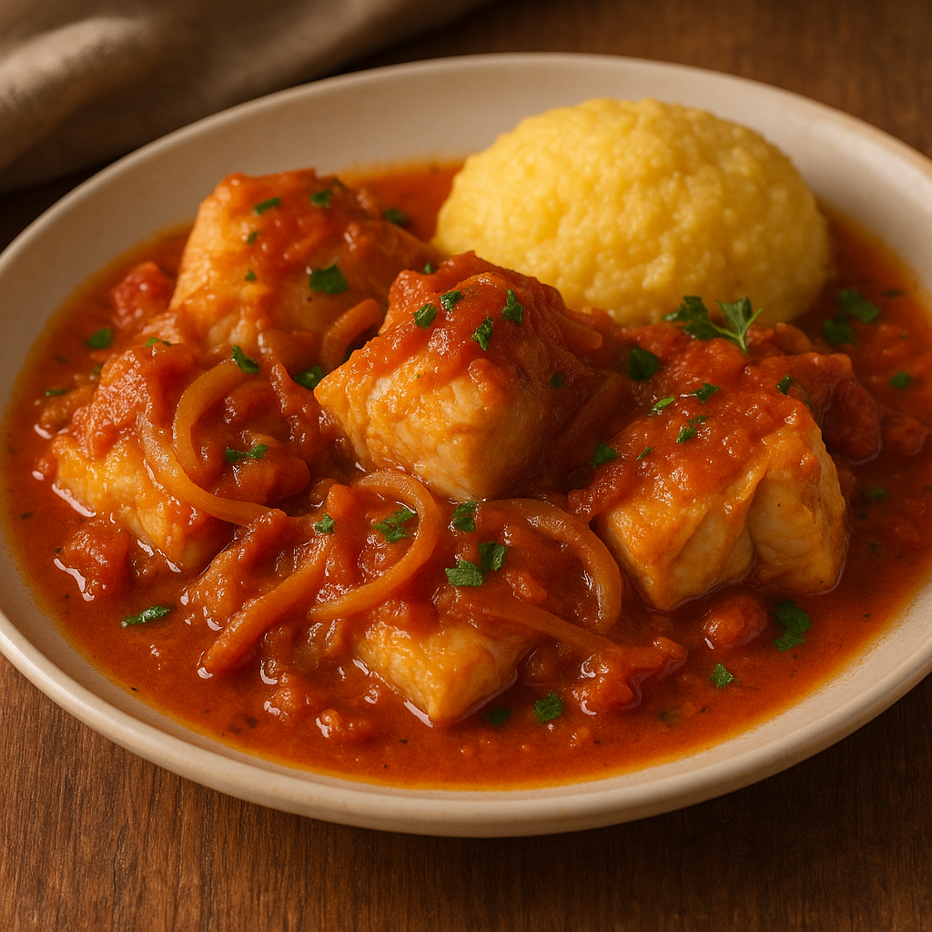 “Prendi baccalà messo in acqua per giorni, leva la pelle e le spine; in padella con cipolla trita e butiro fallo rosolare; poni pomodoro e poco vino, cuoci lento finché si fa tenero; servi con polenta.”