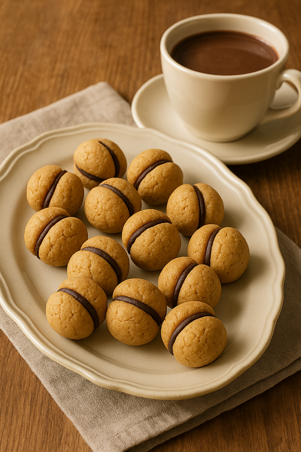 I Baci di Dama sono piccoli biscotti composti da due gusci friabili alle nocciole o alle mandorle, uniti da un sottile strato di cioccolato fondente che ricorda un “bacio”. Il nome deriva proprio dall’immagine romantica di due labbra che si sfiorano. Sono friabili, aromatici e perfetti come dolce da tè, caffè o fine pasto.