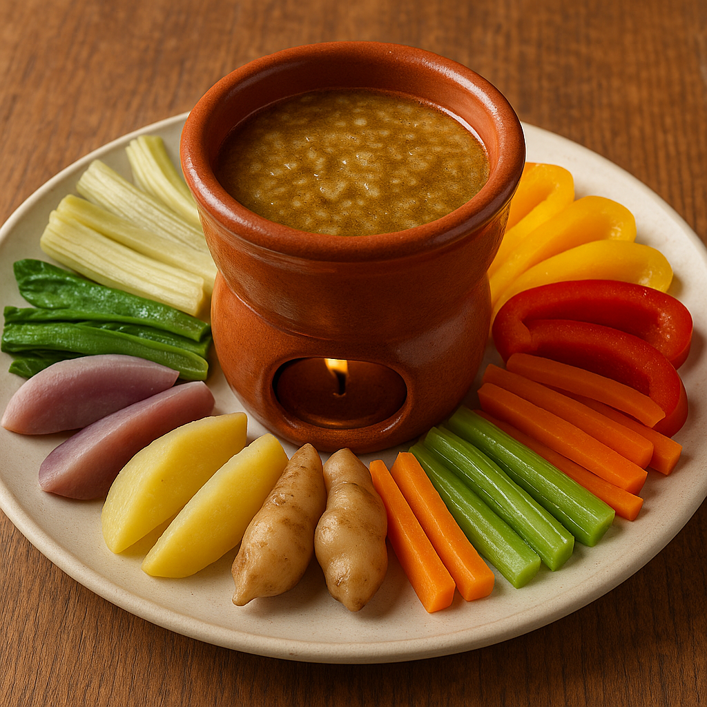 Non è un semplice piatto, ma un vero rito conviviale, consumato in gruppo attorno al fuoco, intingendo verdure di stagione crude o cotte direttamente nella salsa.