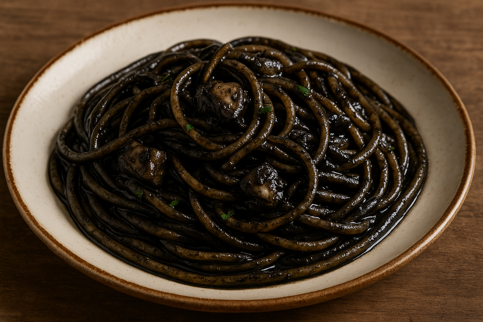 I bigoli al nero di seppia sono una variante di mare dei celebri bigoli, la pasta lunga e ruvida tipica del Veneto, tirata con il torchio. In questo piatto vengono conditi con un sugo a base di seppie e del loro inchiostro, che dona un colore nero intenso e un sapore marino deciso, perfettamente bilanciato da vino bianco, cipolla e prezzemolo.