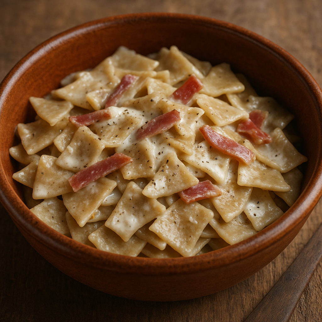 8. Tirare e tagliare: stendere la pasta sottile con il mattarello e tagliarla in rombi o quadrati irregolari di 3–4 cm.