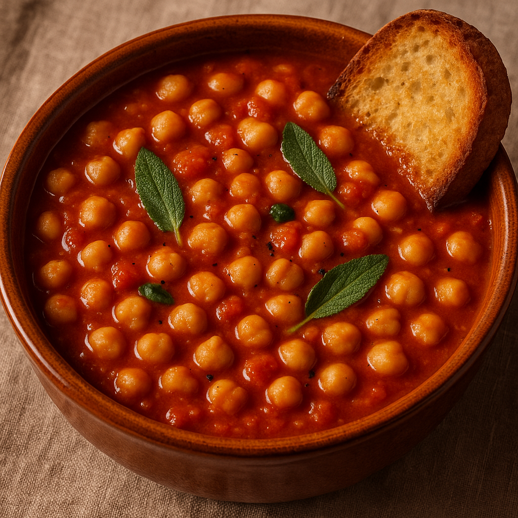 Il cacciucco di ceci è una zuppa densa e sostanziosa preparata con ceci lessati, pomodoro, aglio, salvia e peperoncino. Si serve con pane toscano abbrustolito e strofinato d’aglio, proprio come la versione marinara, ma senza pesce. È un piatto saporito, povero e ricco di proteine vegetali, tipico della tradizione contadina.